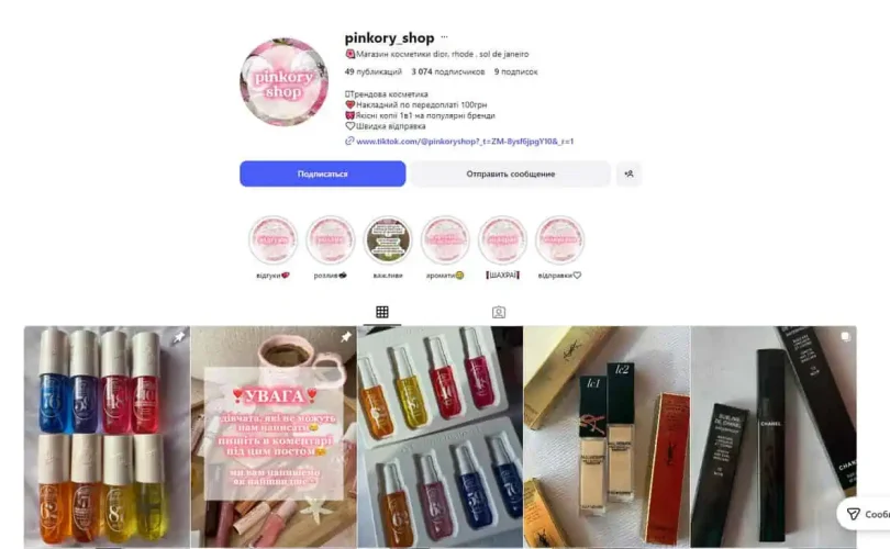 Pinkory_shop - страница в Instagram, которая позиционирует себя как магазин косметики / beauty-товаров: в описании указано "Магазин косметики dior, rhode, sol de janeiro" и указано, что имеется "трендовая косметика" и копии популярных брендов 1 в 1.